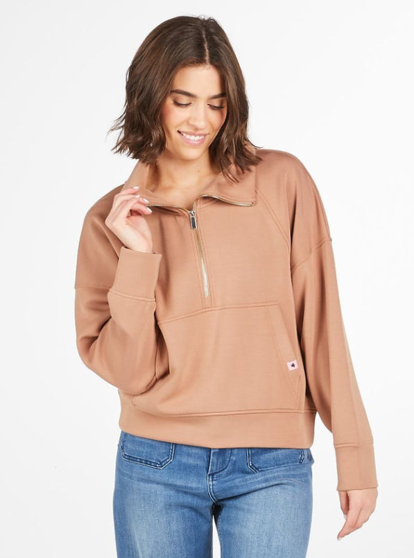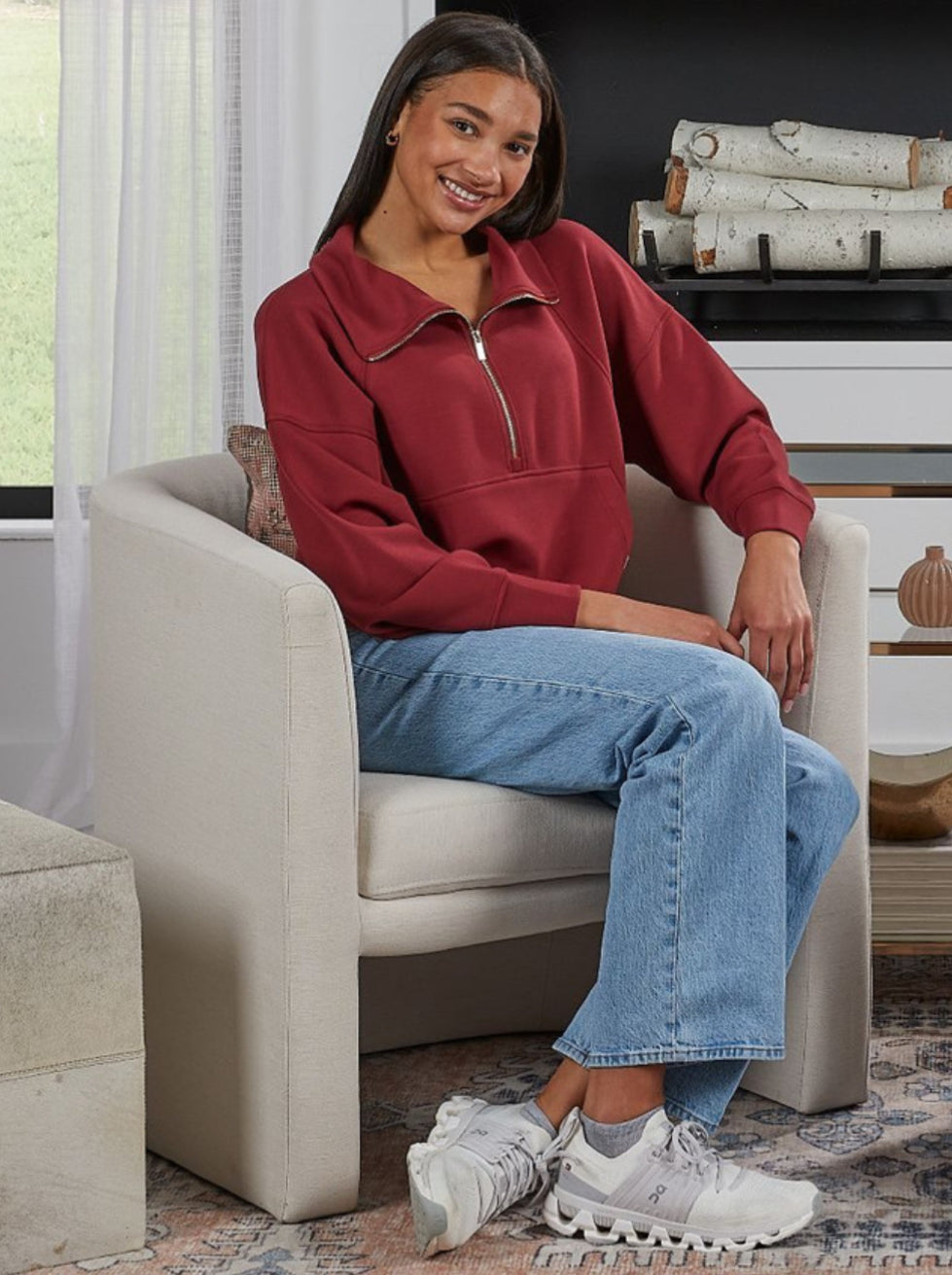 This 1/2 zip pullover features cropped fit, front kangaroo pocket, raglan sleeves, ribbed cuffs and hem, large foldover collar and... Read more