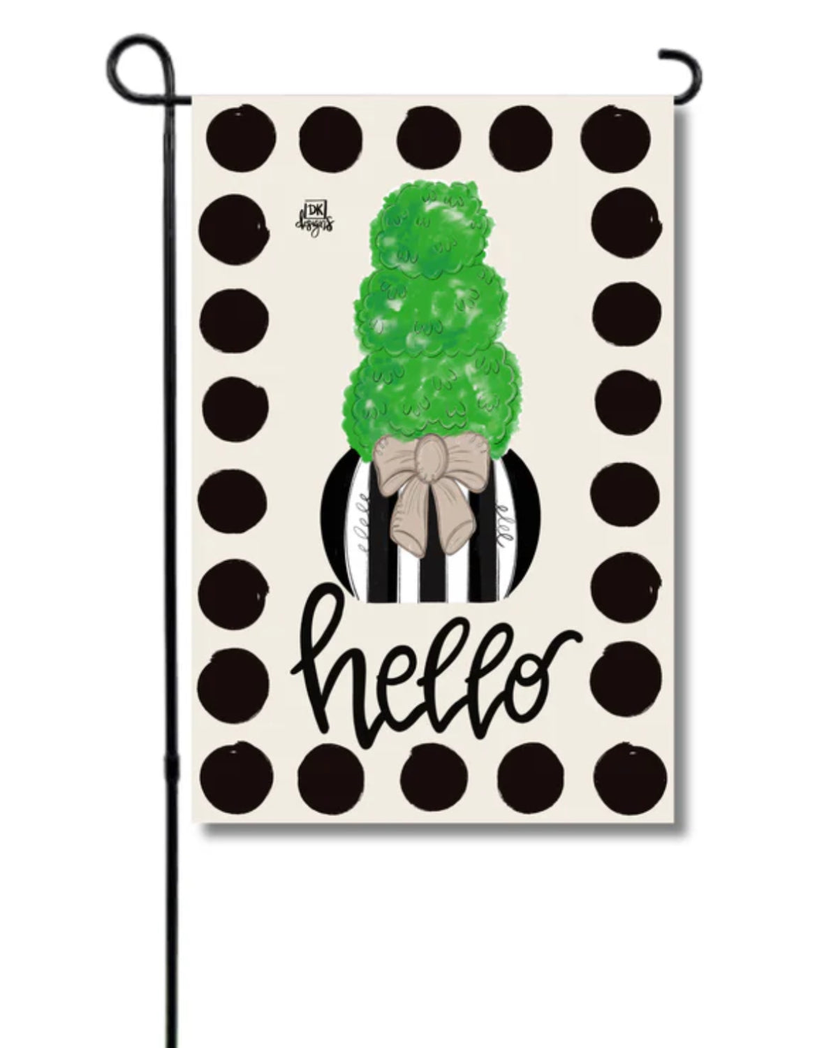 Brighten up your outdoor décor with the Black and White Topiary Glam! This is not your ordinary garden flag. It’s a glamorous décor piece featuring a topiary designed bush in a black and white pot with a tan bow, along with a "Welcome" message.