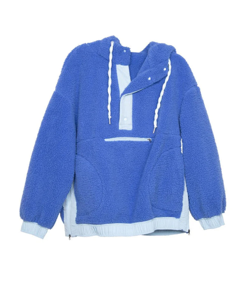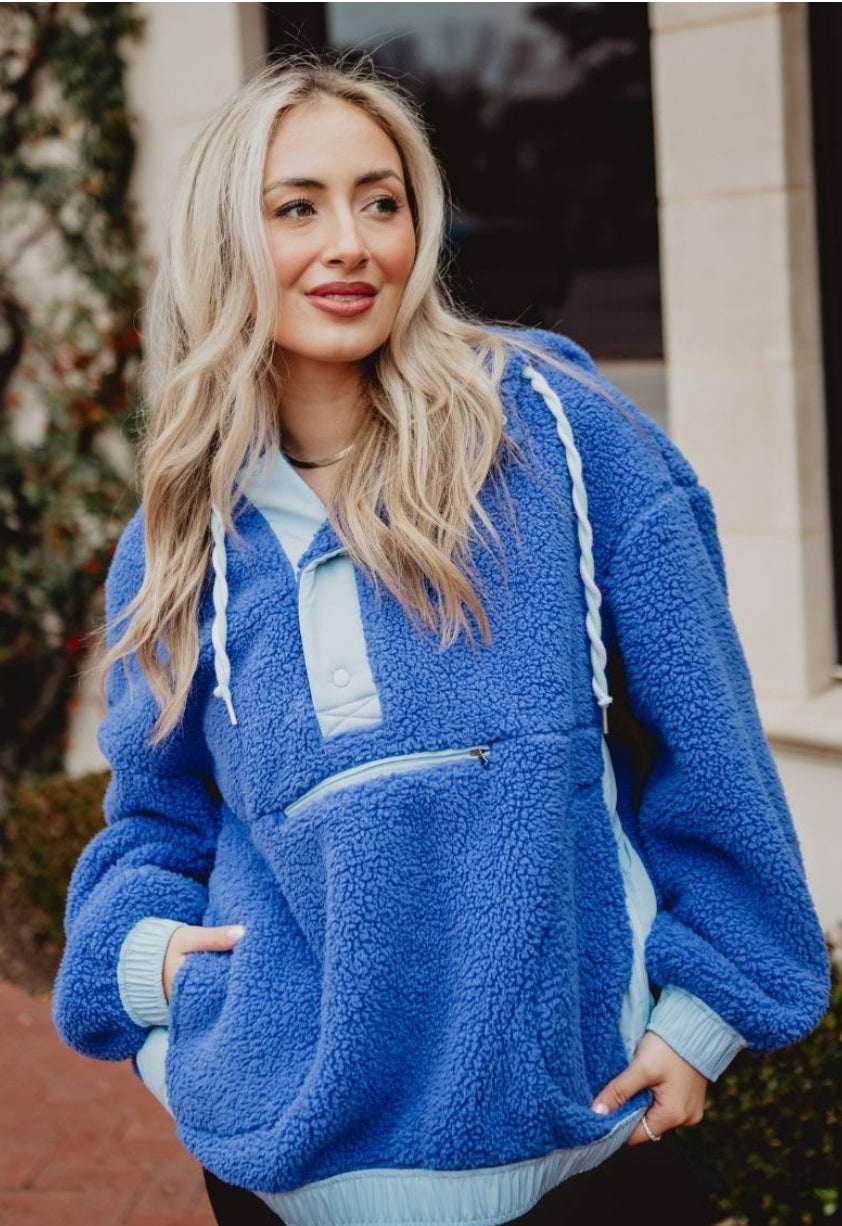 Your cozy day uniform just leveled up. This two-toned sherpa pullover is soft, oversized, and full of personality thanks to its playful blend of bold and baby blues. Made with super snuggly sherpa fleece, it wraps you in warmth without sacrificing style. The pullover fit keeps it casual, while the colorblock look makes it feel fresh and fun—aka the perfect piece to throw on for coffee runs, fall road trips, or snapping pics in the pumpkin patch.