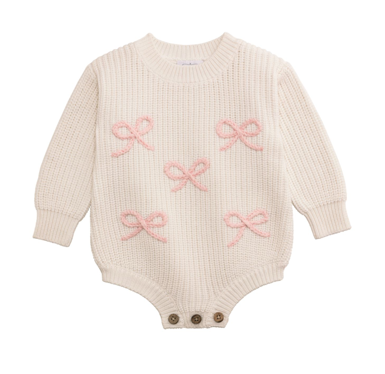 Long sleeve sweater knit bubble with dimensional chainstitch embroidered bows. Coconut wood button inner leg closure. Read more