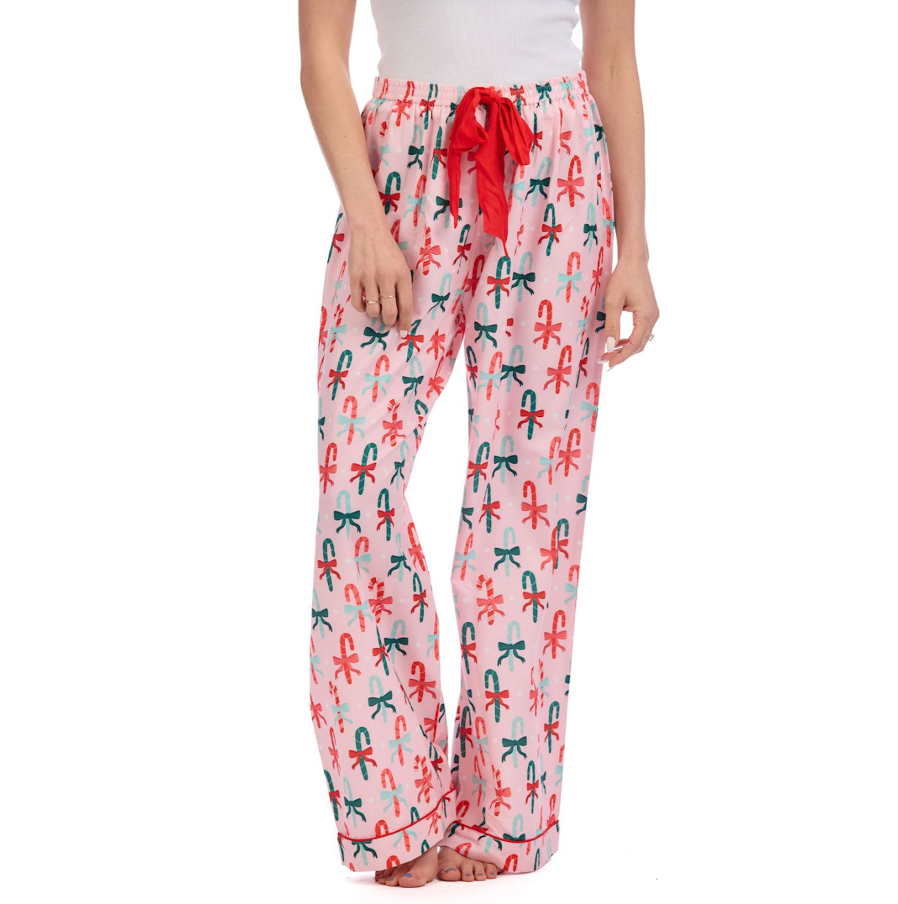 Polyester pajama pants feature piping detail and elasticated waist with bow tie. Inseam measures approximately 29" on size small Read more