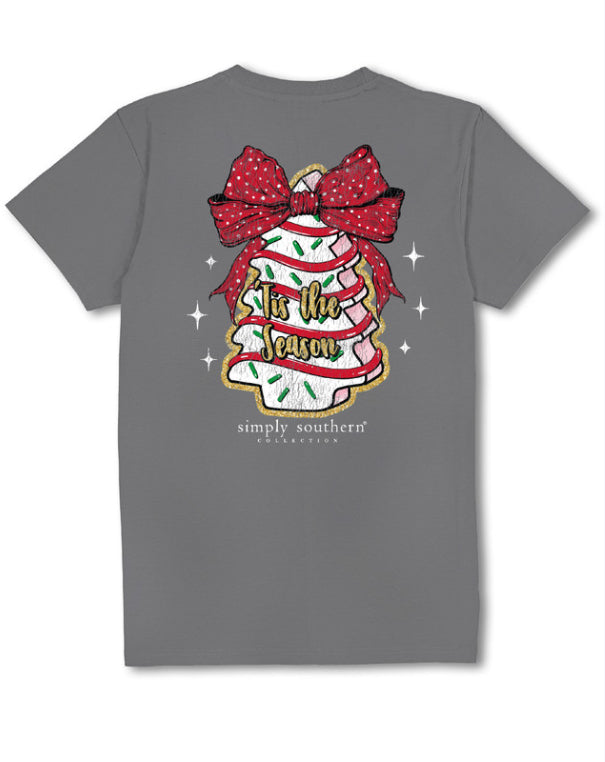 Mineral washed coal short sleeve shirt with the phrase ''Tis the Season' on a cake in the shape of a... Read more