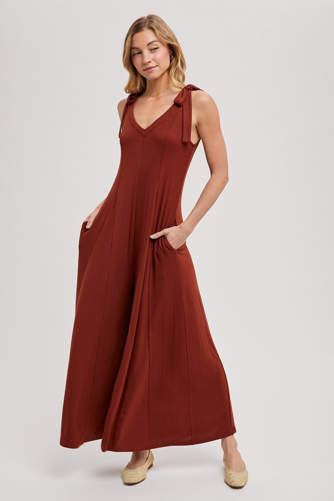 The comfy knit wide-leg jumpsuit with adjustable self-tie shoulder straps offers both style and comfort for versatile wear. Crafted from... Read more
