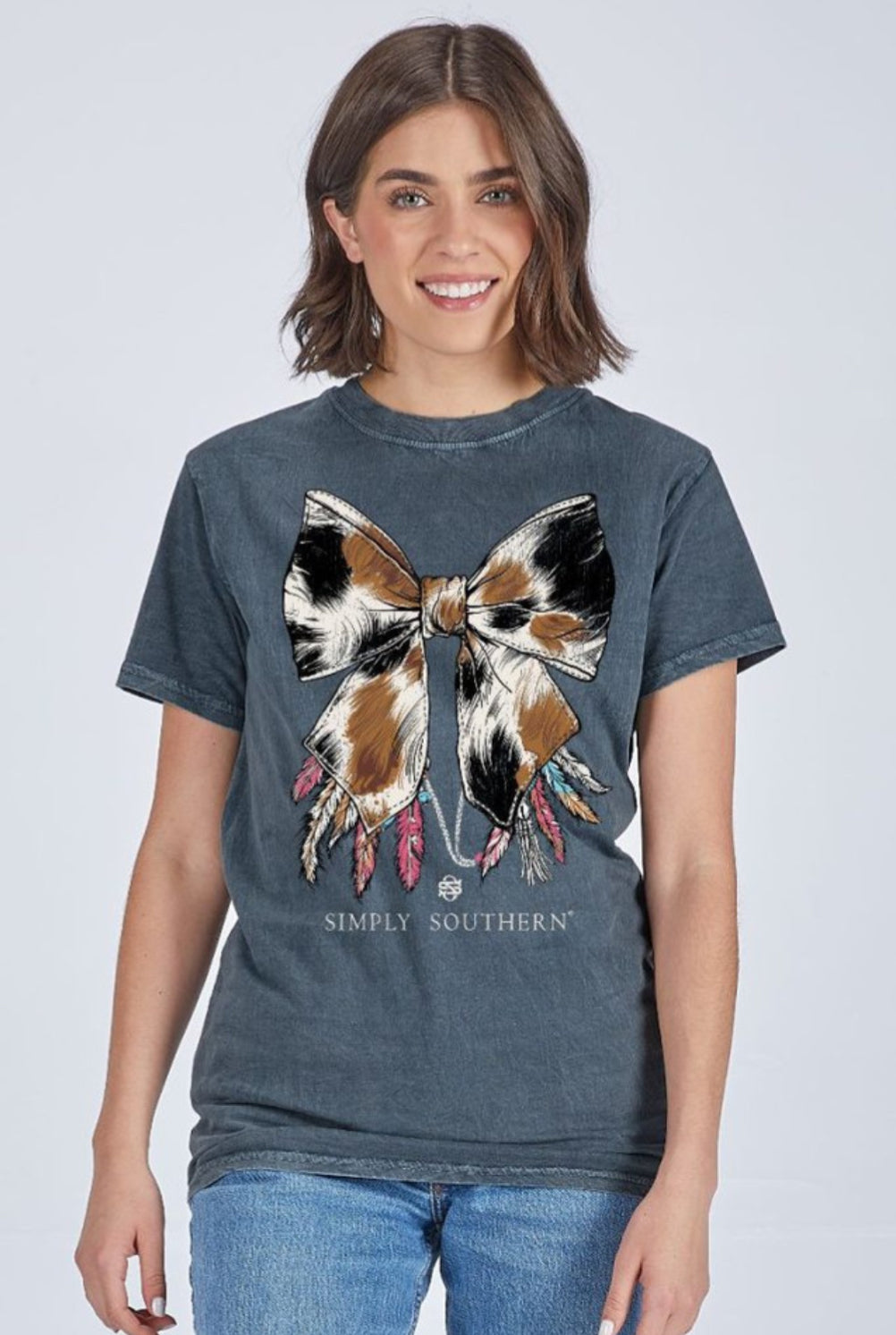 Mineral washed dark grey short sleeve shirt with a cow patterned bow adorned with multicolored feathers. Simply Southern logo below.... Read more