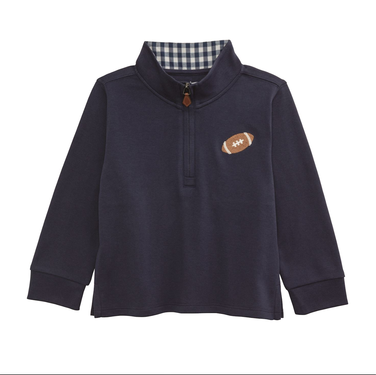 Interlock pullover features quarter zip neckline, gingham lining. side vent hem and embroidered football icon.