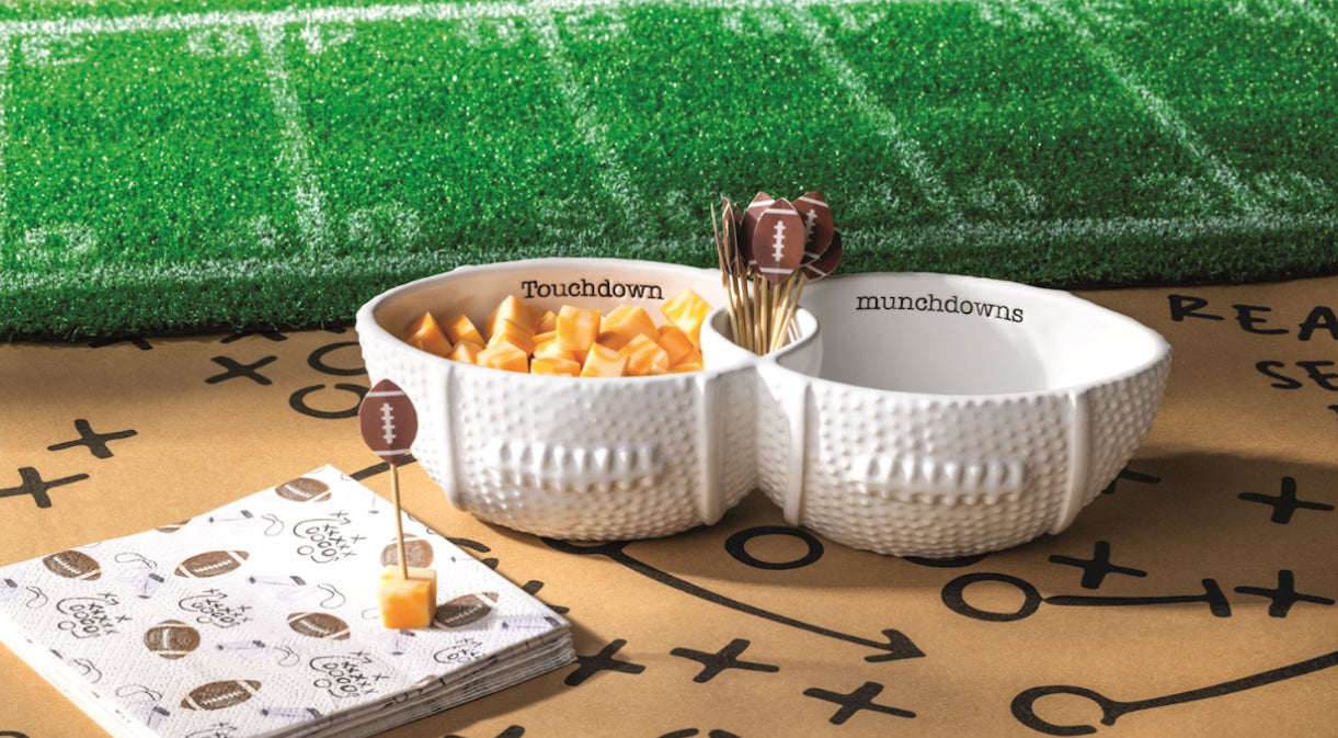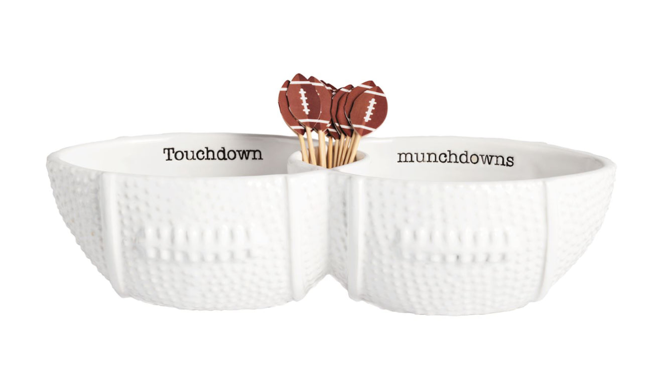 2-piece set: Football Toothpick Server Textured ceramic double dip server with center toothpick well Includes pack of paper football topped... Read more