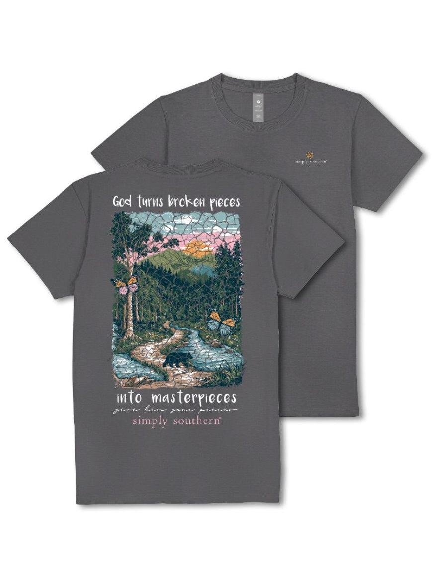 Mineral washed coal short sleeve shirt with the phrases 'God turns broken pieces into masterpieces' and 'Give him your pieces'.... Read more