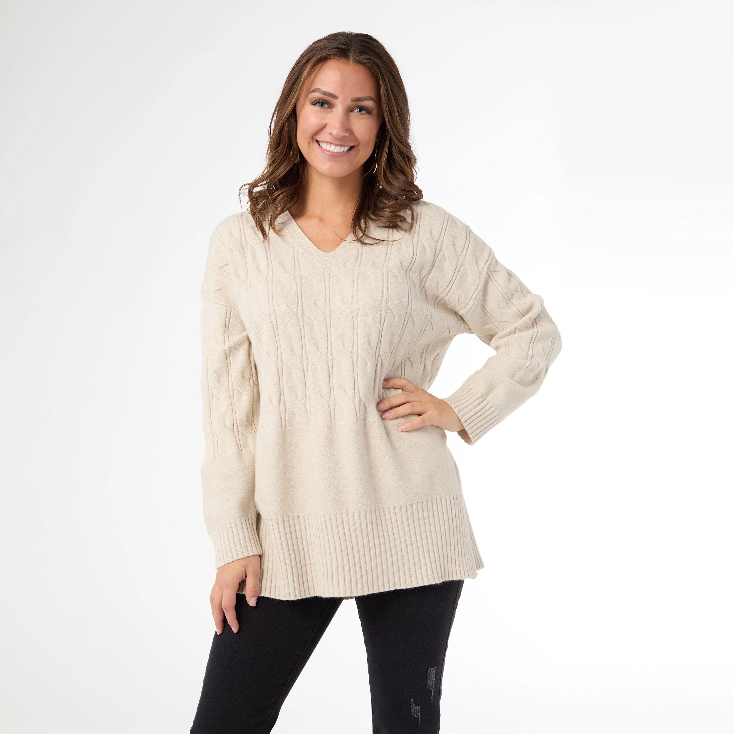 Heavenly-Luxe V Neck Cable Sweater w/ Rib Bottom