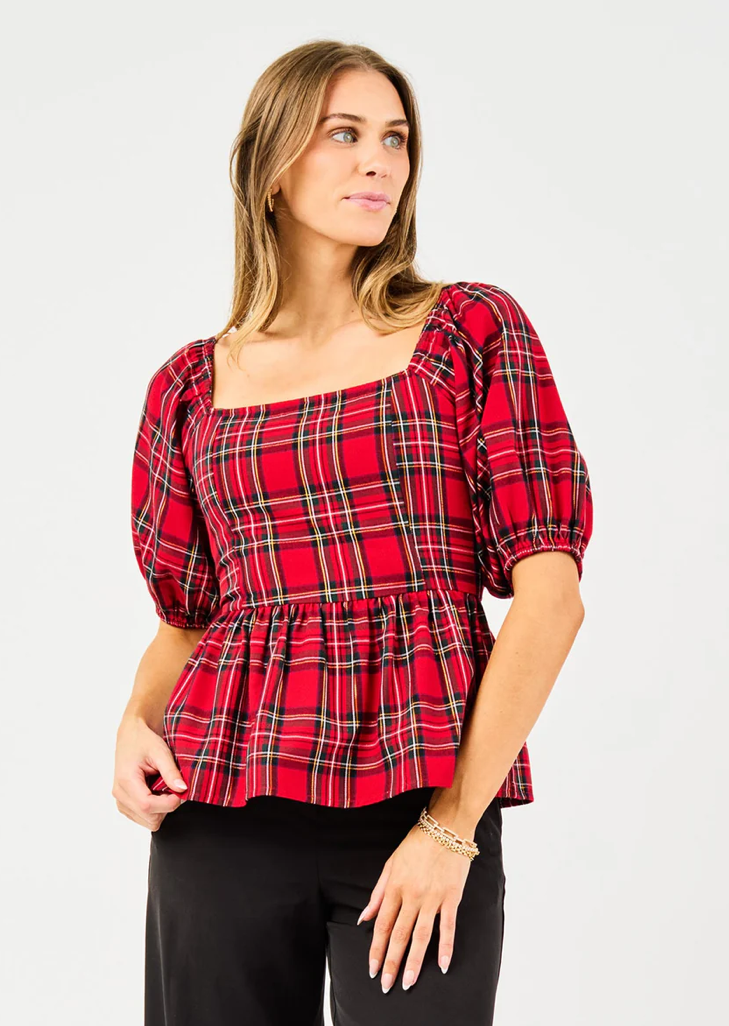 Add a touch of holiday sparkle with the Isabel Top. Crafted in classic plaid woven with metallic accent thread, it features a flattering square neckline and a smocked back panel for a perfect fit. Short puff sleeves with elastic cuffs add feminine charm, while the easy slip-on style makes it an effortless choice for festive celebrations.