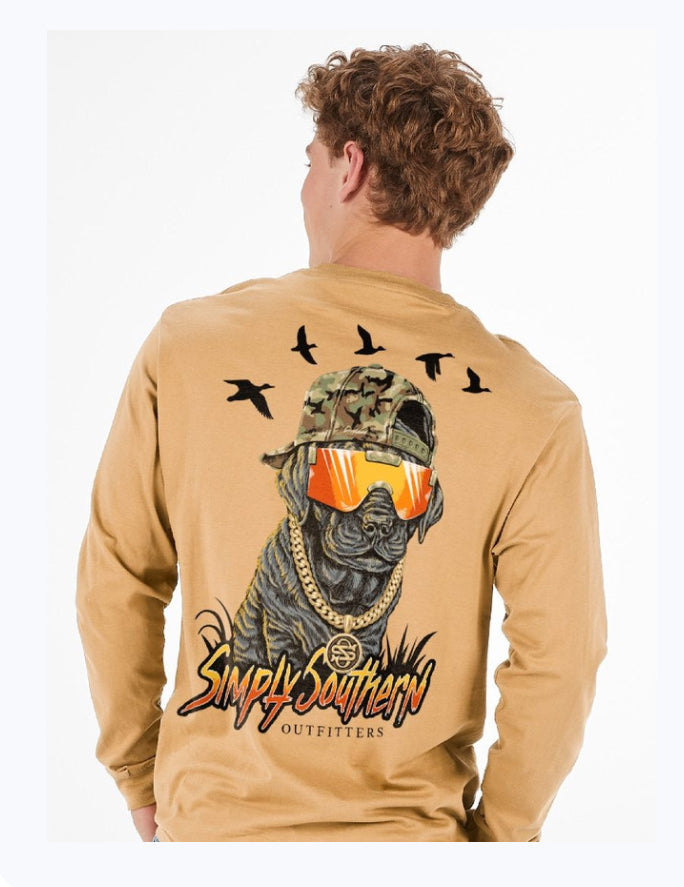 Bisque long sleeve shirt with a dog wearing shades, a camo hat, and gold chain and ducks flying overhead. Simply... Read more