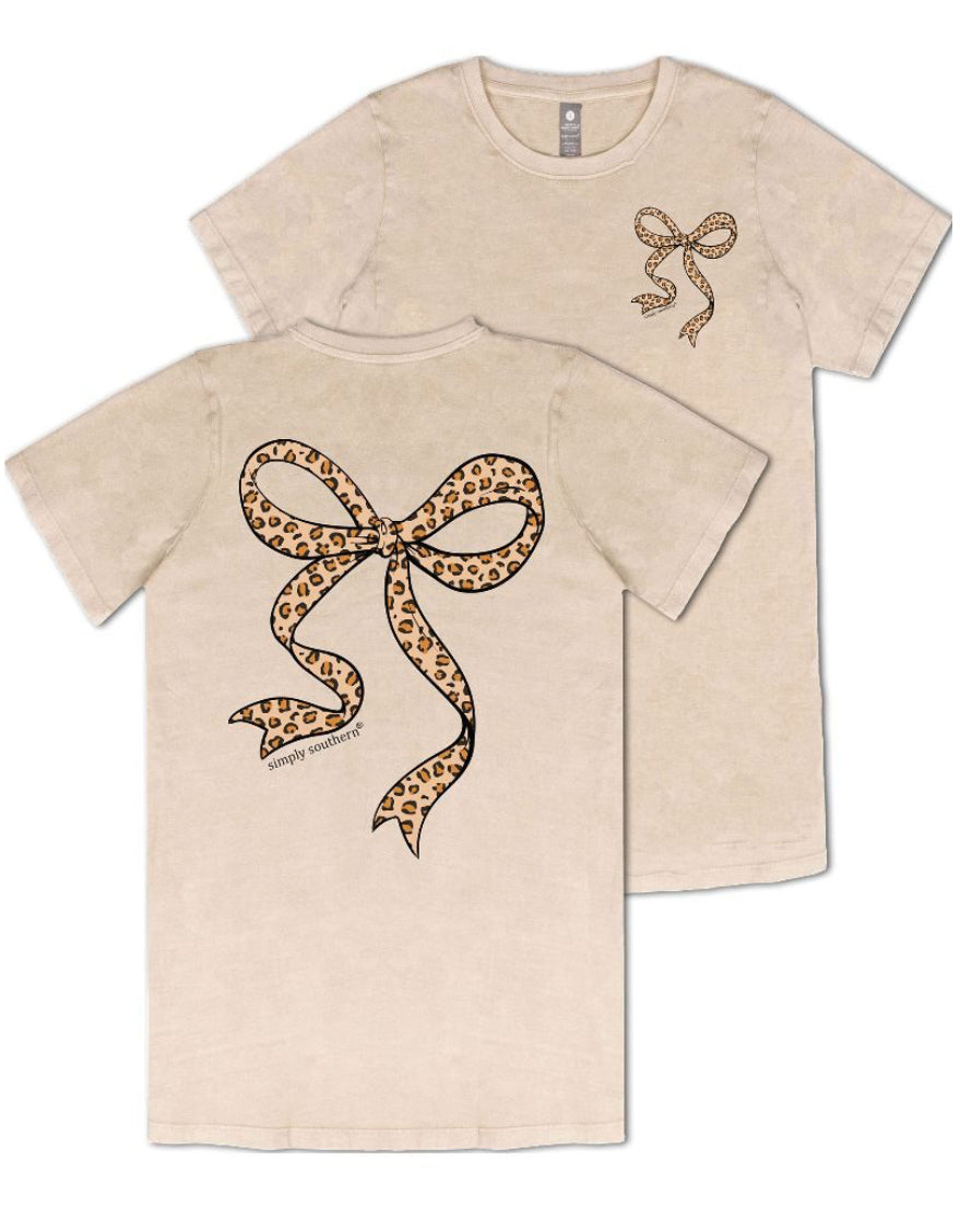 Mineral washed ecru short sleeve shirt with a leopard print bow. Simply Southern logo below. Same design in center of... Read more