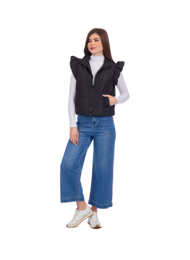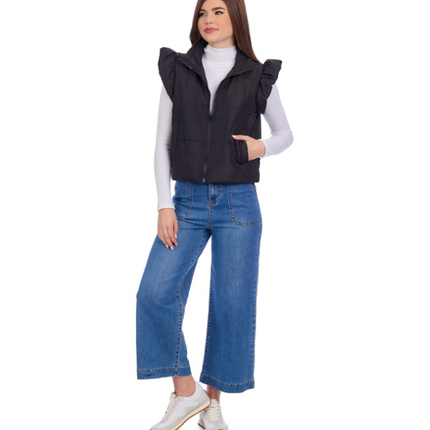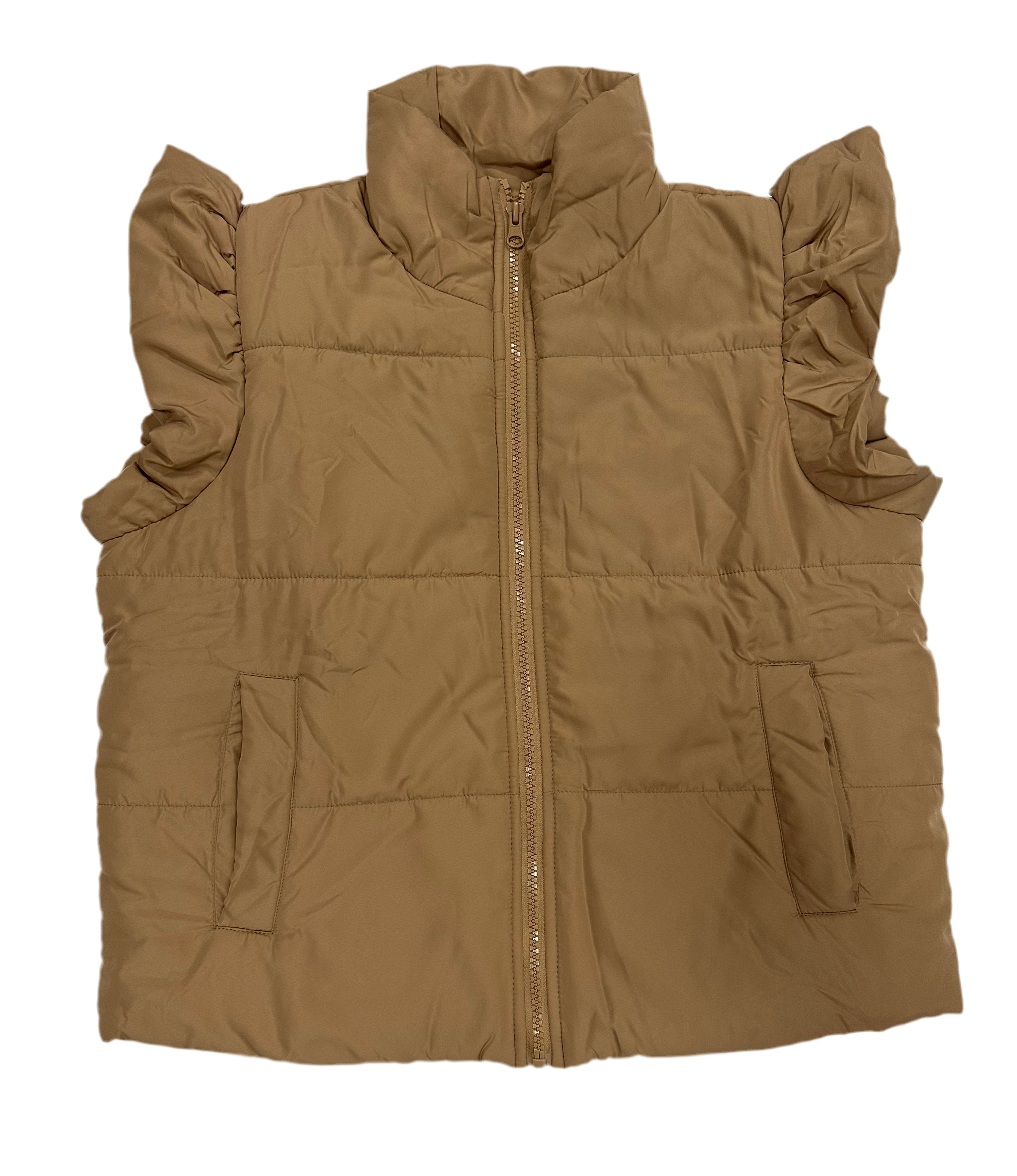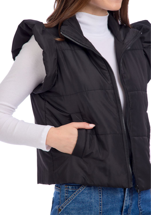 Quilted nylon vest features ruffle sleeve detail, pockets and front zipper closure. Measures approximately 21 1/2" from shoulder to hem... Read more