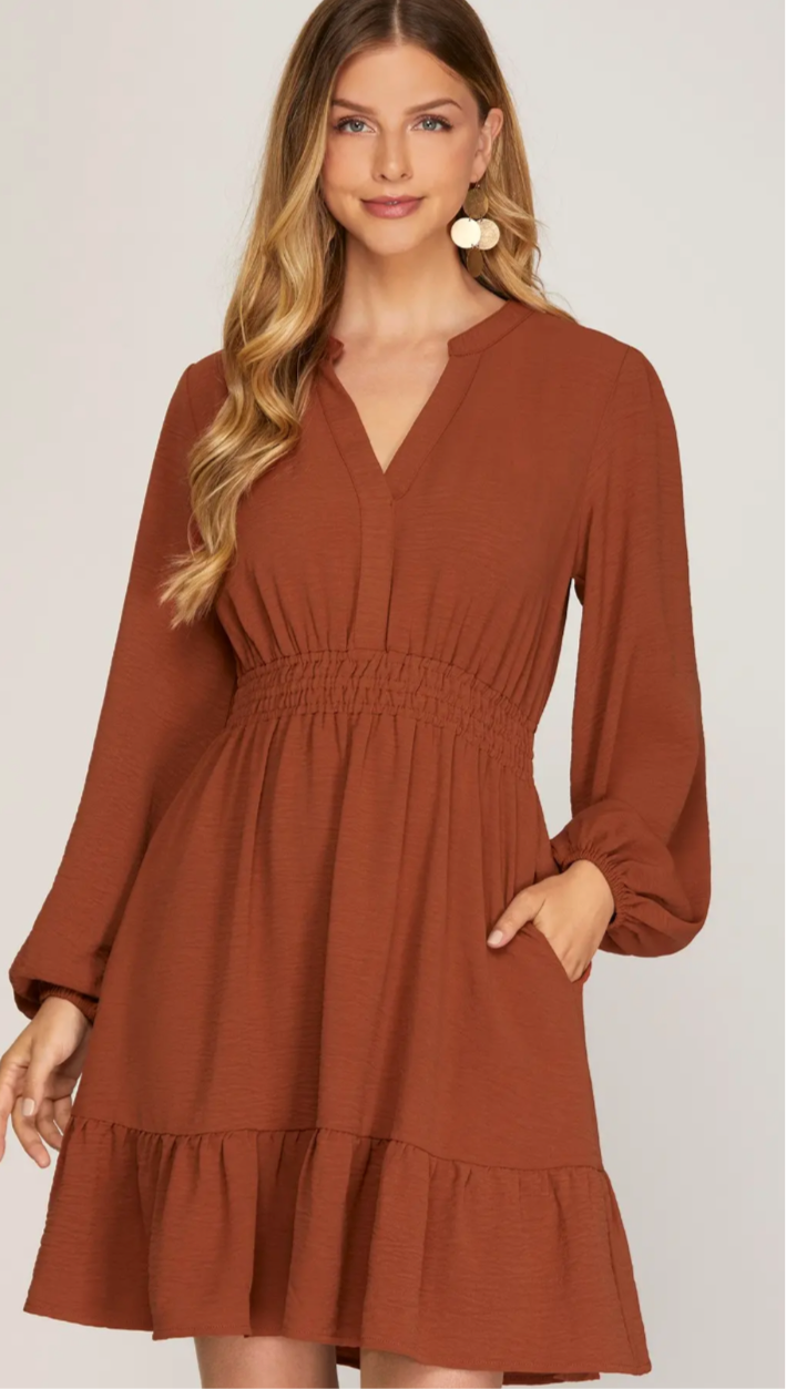 LONG SLEEVE ELASTIC WAIST WOVEN DRESS WITH POCKETSMODEL IS 5'8" AND MODEL IS WEARING SIZE SMALL 100%POLYESTER Read more