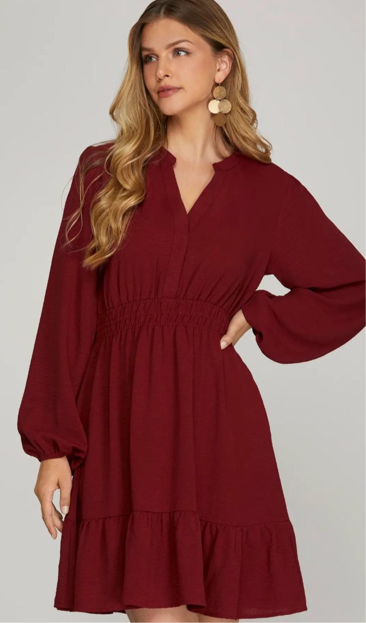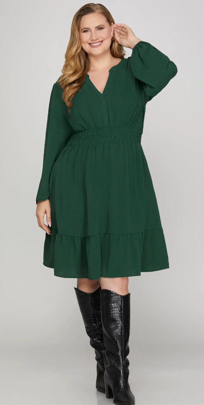 Long Sleeve Elastic Waist Woven Dress