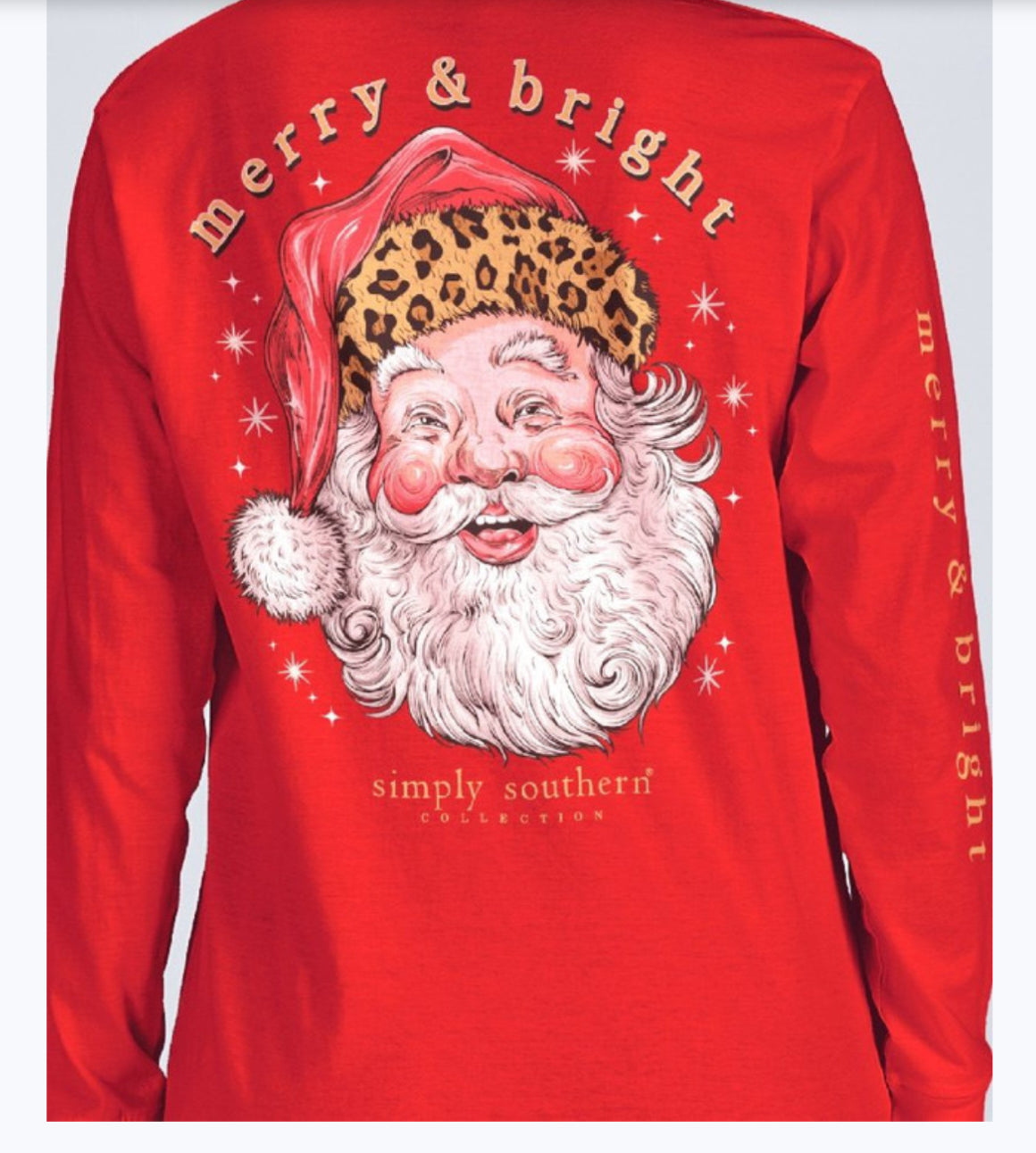 Red long sleeve shirt with the phrase 'merry and bright' in gold glitter and santa wearing a leopard trimmed santa... Read more