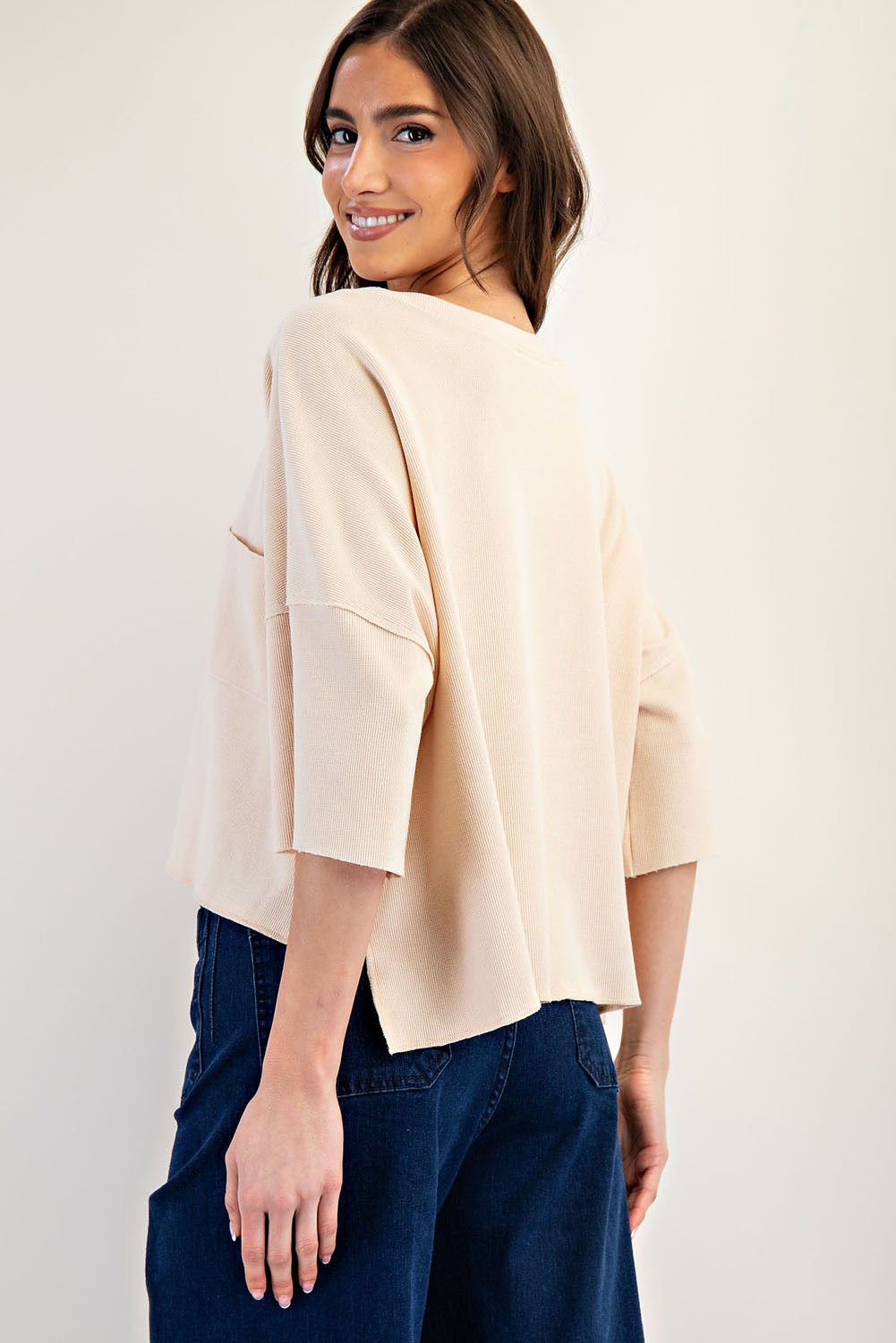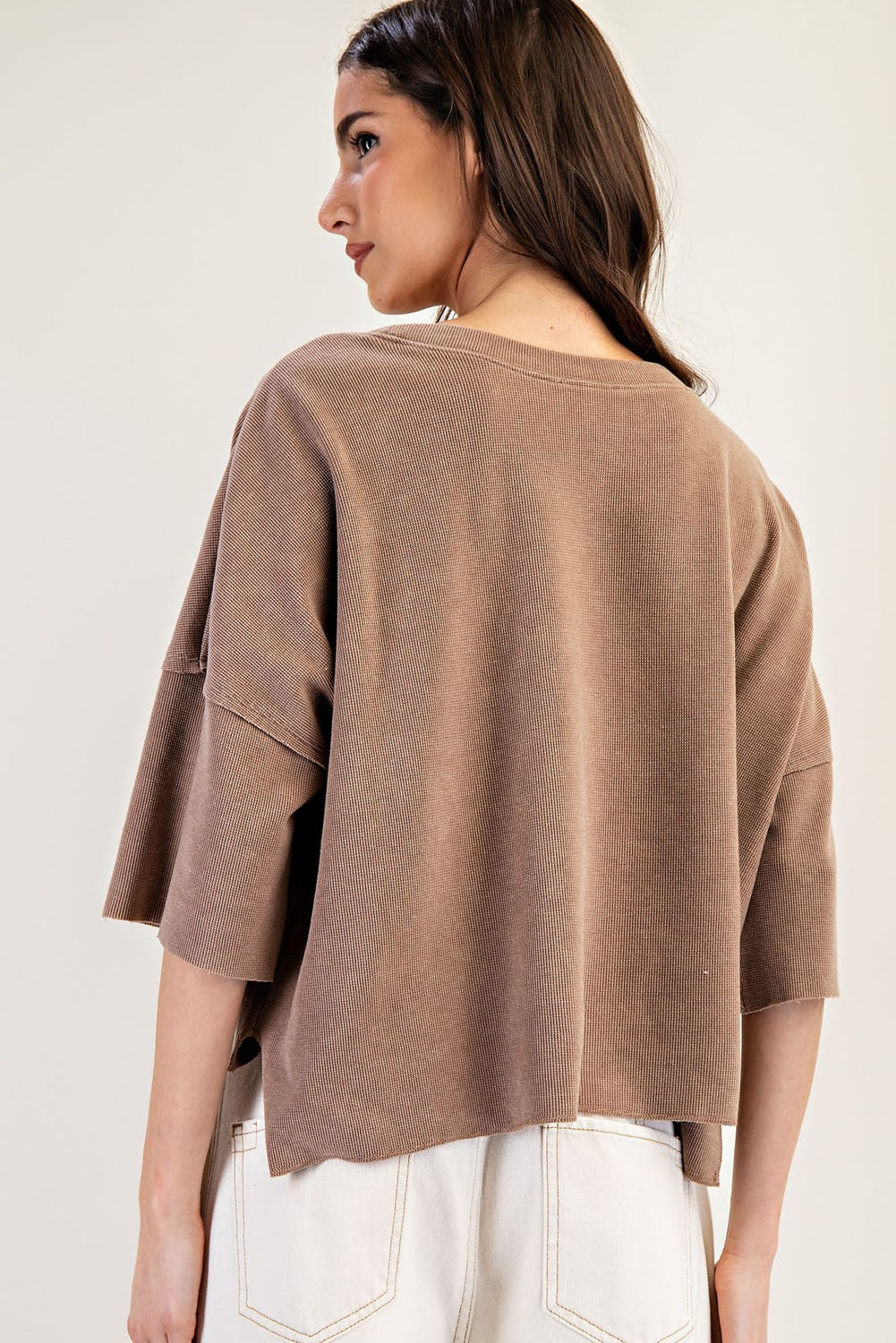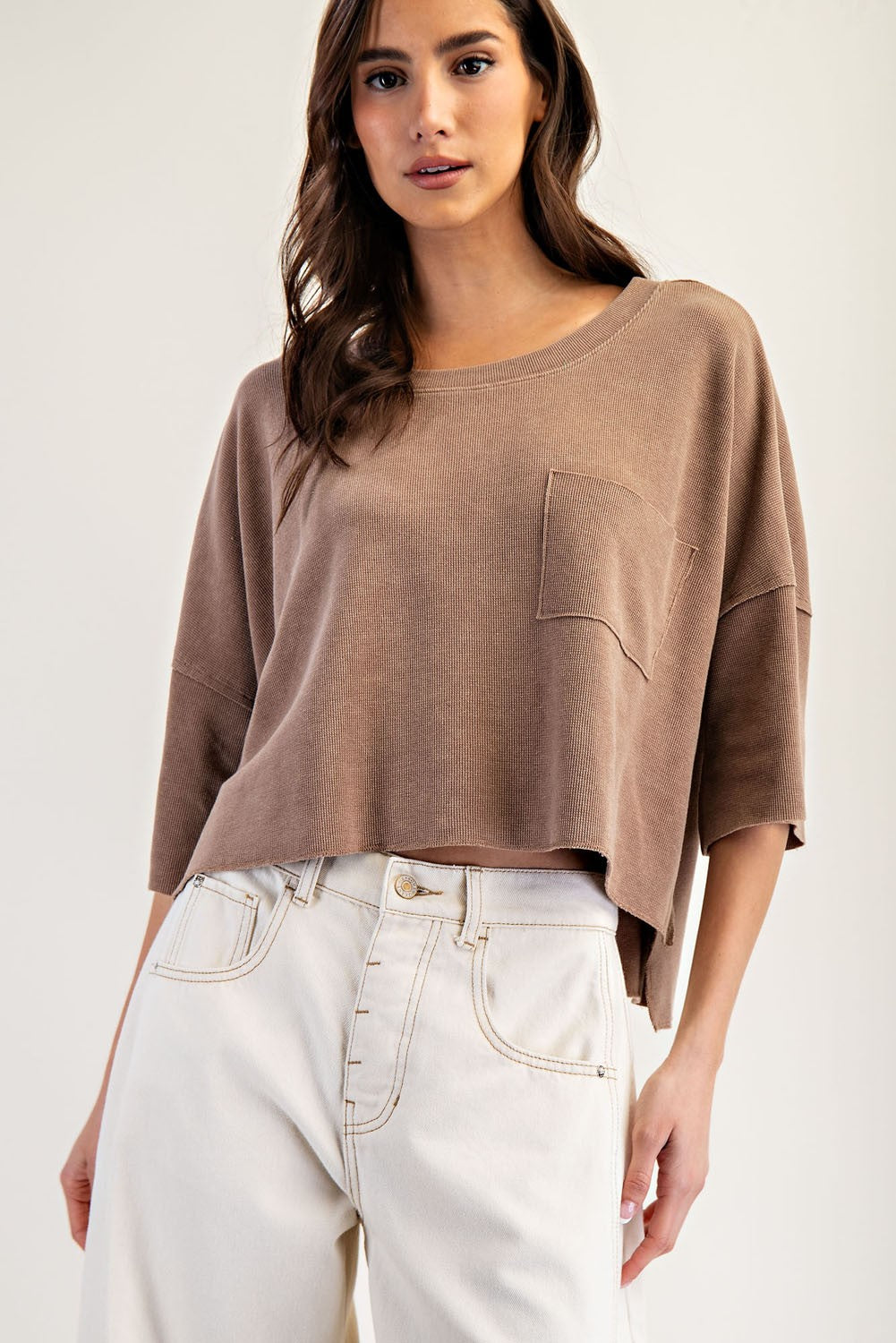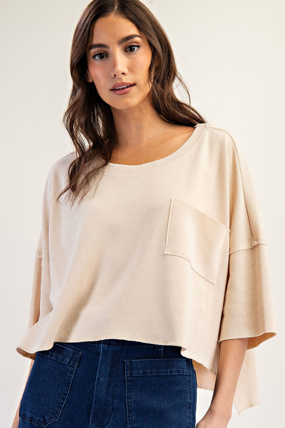 This mineral washed boxy knit top features a relaxed fit, wide elbow length sleeves, a rounded neckline, a single chest... Read more