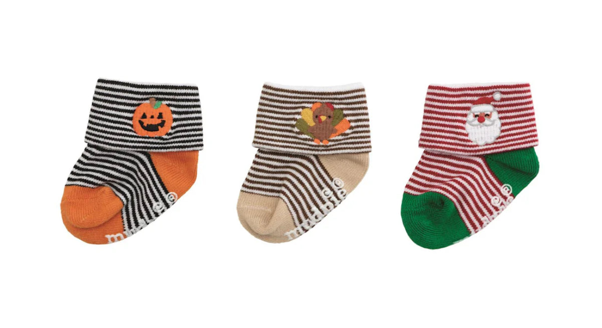 Set of three pairs of cotton hosiery socks with Halloween, Thanksgiving and Santa embroidery at ankle cuffs Material: 80% Cotton... Read more