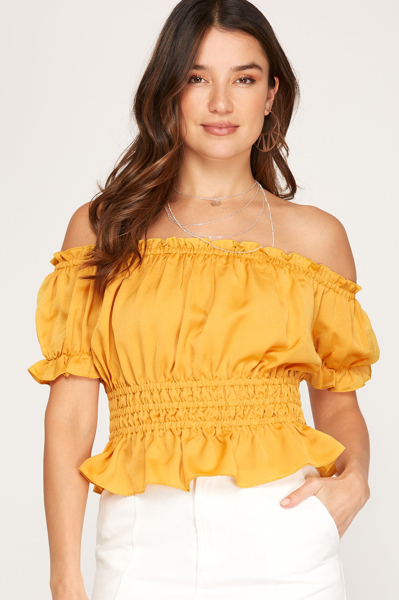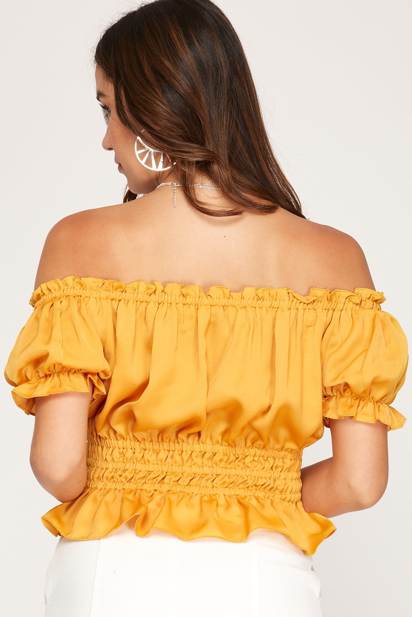 The cutest off shoulder top in the prettiest gold color for game days with a satin shimmer, perfect for anytime... Read more