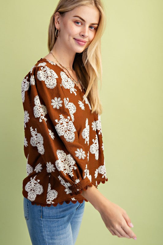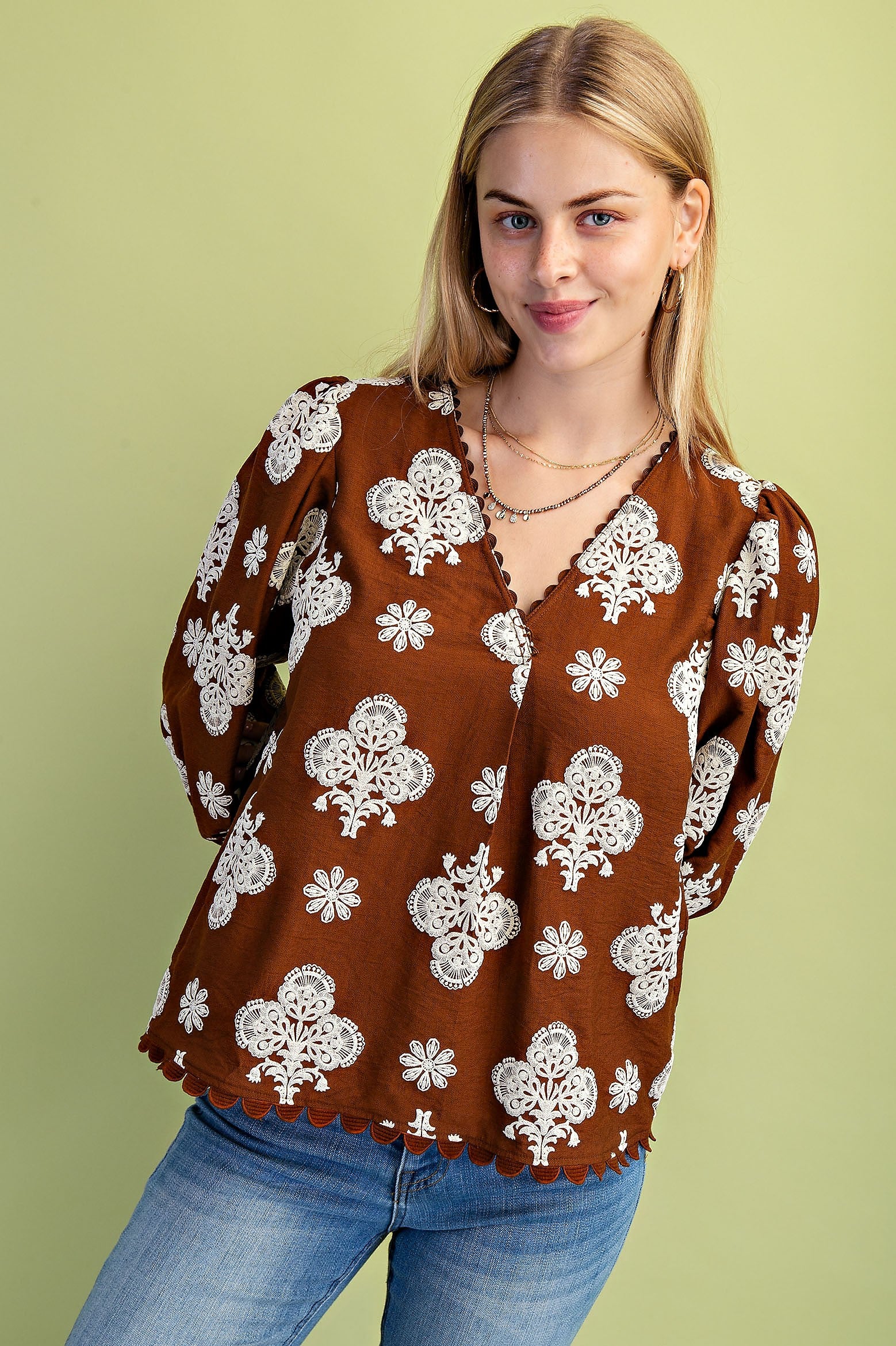 Puff Printed V-Neck Blouse with 3/4 Length Sleeves and Ric-Rac Trim Model is 5'8" wearing a small. Read more