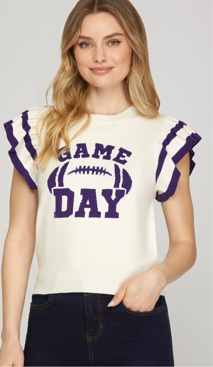 GAME DAY - RUFFLED SLEEVE SWEATER TOP WITH CONTRAST DETAILMODEL IS 5'8" AND WEARING SIZE SMALL S:50%VISCOSE 25%POLYESTER 25%NYLON C:50%VISCOSE... Read more