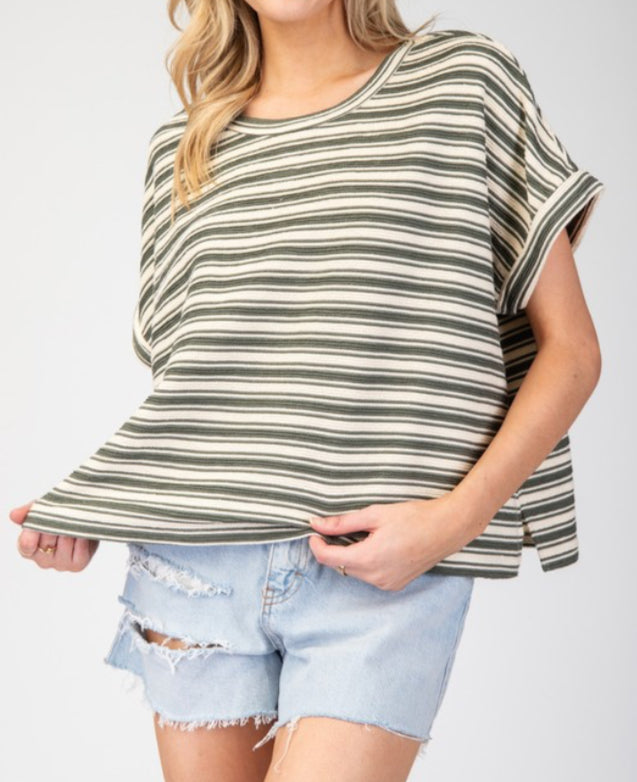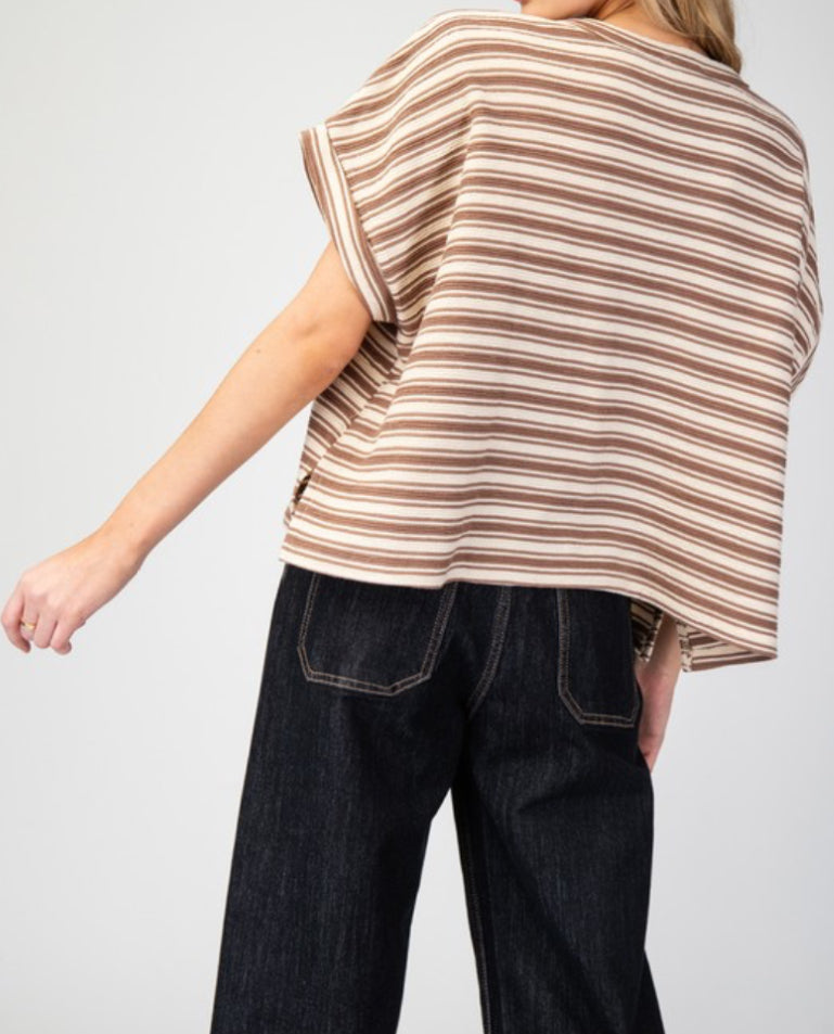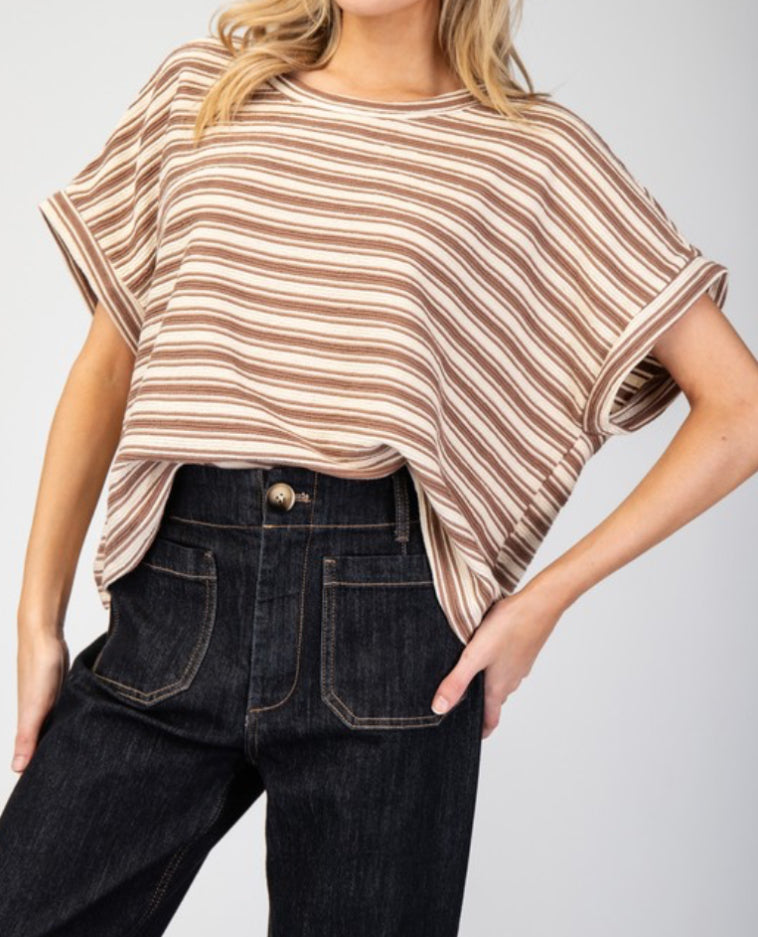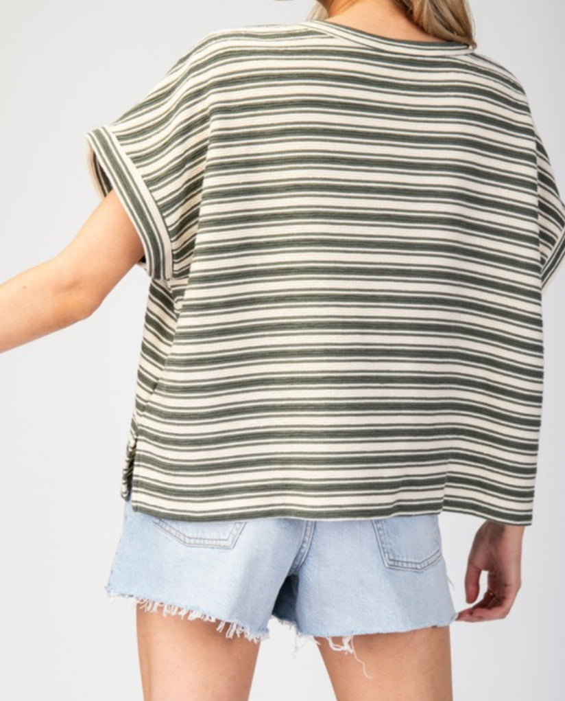 Striped texture short sleeve top featuring a rounded neckline, two side slits and is a boxy silhouette. Read more
